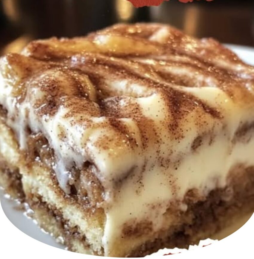 Moist cinnamon-spiced cake soaked in sweet glaze, topped with cream cheese frosting—just like a giant cinnamon roll!