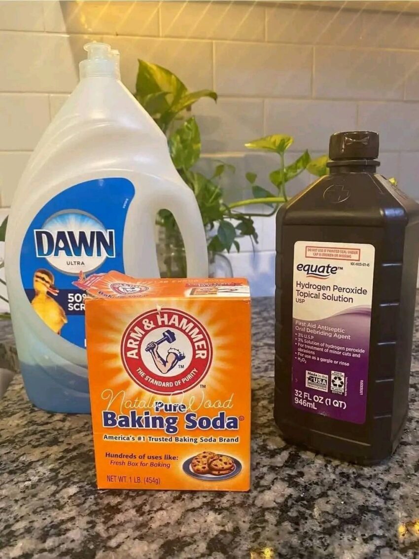 1. In a bowl, combine dish soap, vinegar, baking soda, and warm water. Stir gently (it will fizz slightly).