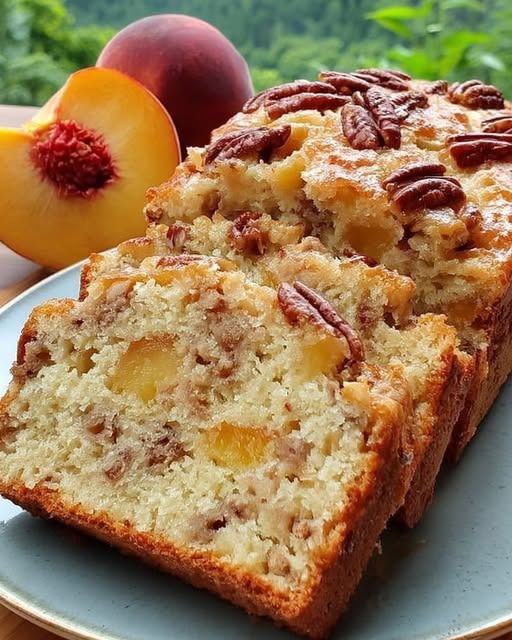Moist, lightly sweet, and packed with juicy peaches + crunchy pecans! Perfect for breakfast, brunch, or a cozy snack.