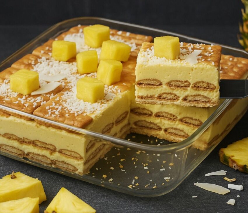 A luscious Brazilian dessert with layers of caramelized pineapple, buttery cookies, and creamy custard—no baking required!