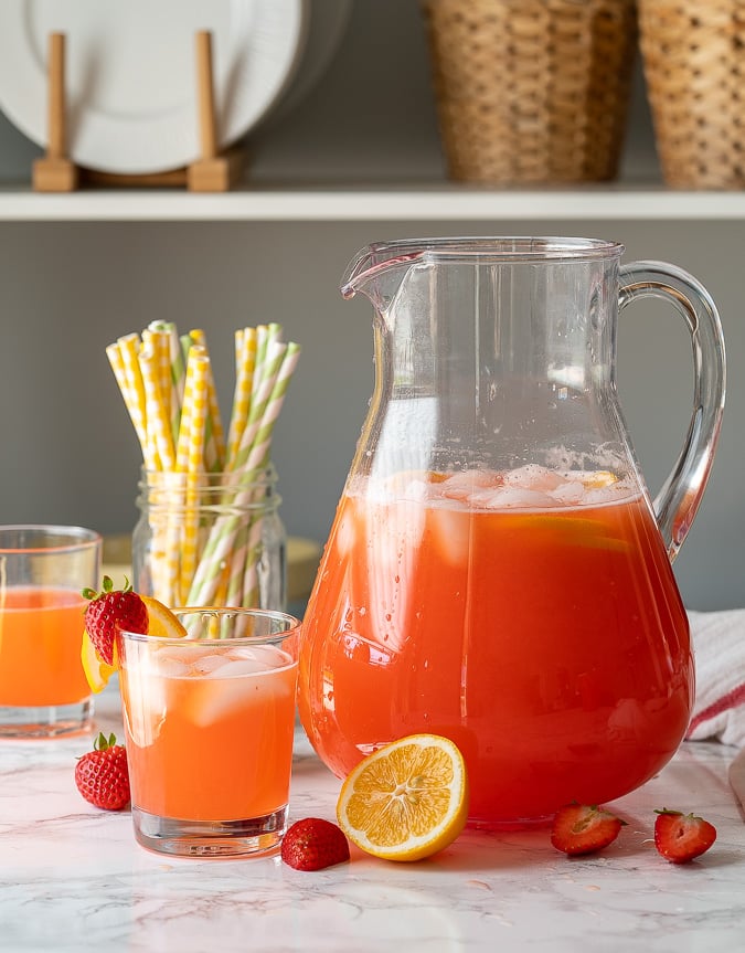 Garnish with sliced strawberries, lemon wheels, or mint.
