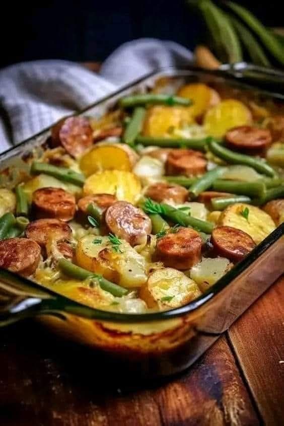 A hearty, one-dish wonder with savory sausage, tender green beans, and creamy potatoes—baked to golden perfection!